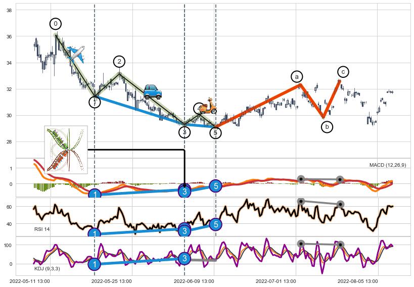 ➣ 1,3,5驱动浪MACD, RSI, KDJ走势都出现【常规背离】反转信号增强