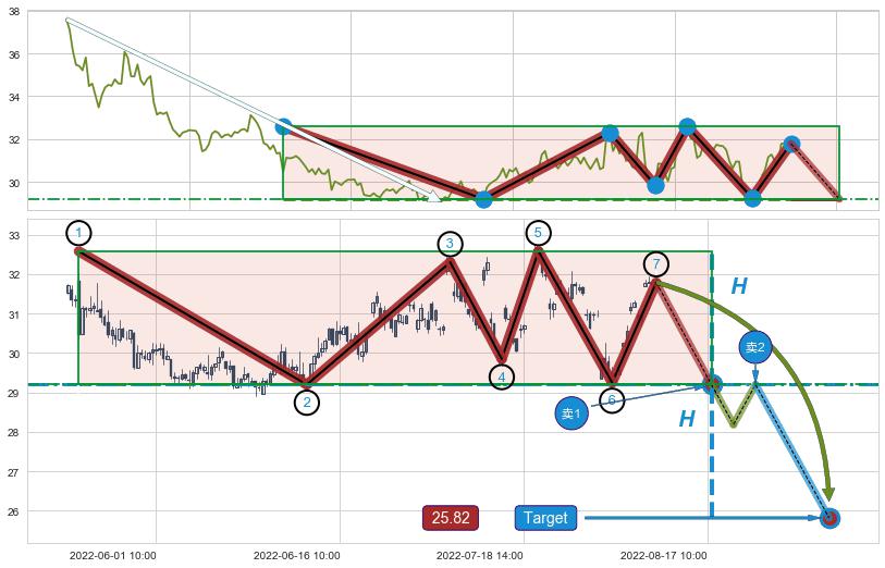 ➣ 【阻力】连续作用在→【③⑤⑦】形成上阻力震荡平行线