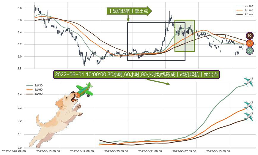 ⚀ 2022-05-19 13:00:00小时-2022-06-14 14:00:00小时显现 30小时-60小时-90小时均线 【战机起航】卖出点 看空信号,后市看跌,卖出