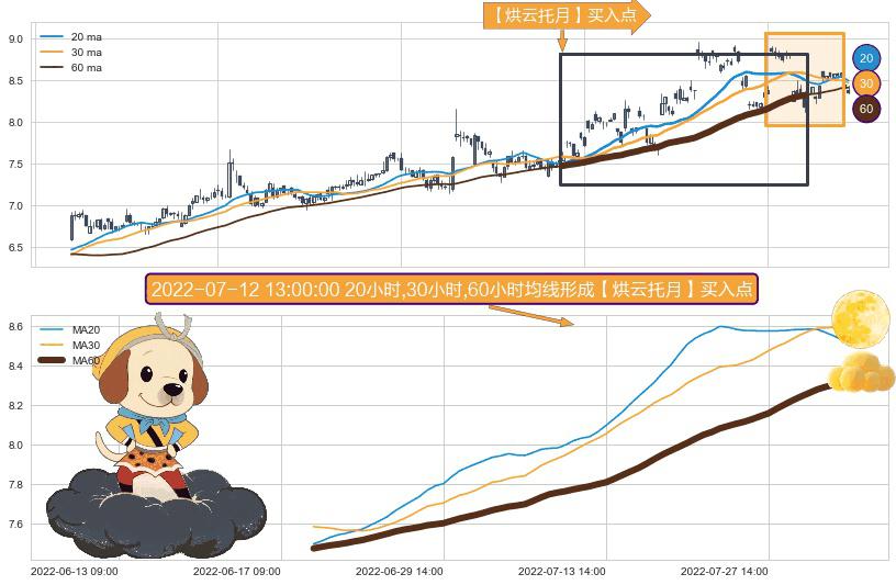 形态多维评估: ⚀ 2022-06-17 14:00:00小时-2022-08-03 14:00:00小时显现 20小时-30小时-60小时均线 【烘云托月】买入点 看多信号,后市看涨,买入