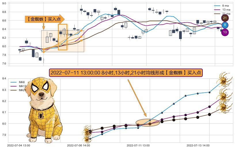 形态多维评估: ⚀ 2022-07-11 13:00:00小时显现 8小时-13小时-21小时均线 【金蜘蛛】买入点 看多信号,后市看涨,买入