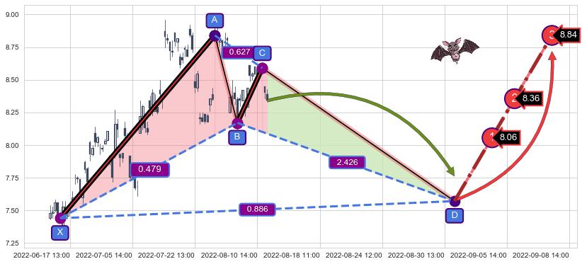 ➢ 距离预测D点位置有足够的下跌空间, 与看涨【蝙蝠】形态相反,实际方向【看跌】