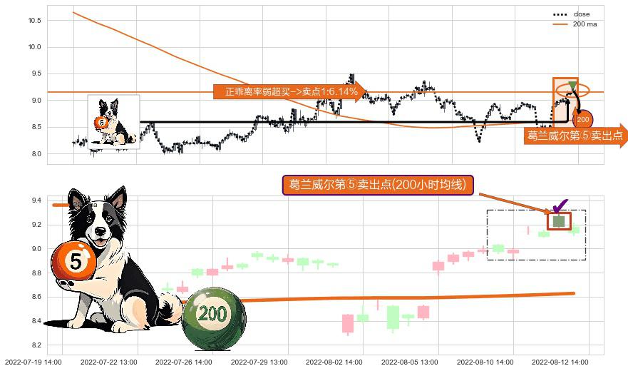 ⚀ 2022-08-12 13:00:00-小时显现 葛兰威尔均线 200小时均线 第⑤卖出点 上升趋势均值回复的短线回落信号,后市看跌,卖出信号