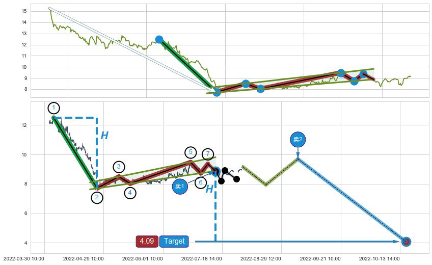 | 2 🅚:徐缓下降 ➕ 📐:升旗形下行突破支撑位破位, 猜想持续下沉下跌,被突破的支撑位已变为阻力位 ☞ 看空信号 ⇥ 【🅚线】交织【图形】⇥ 综合量化分数: 45 | > |