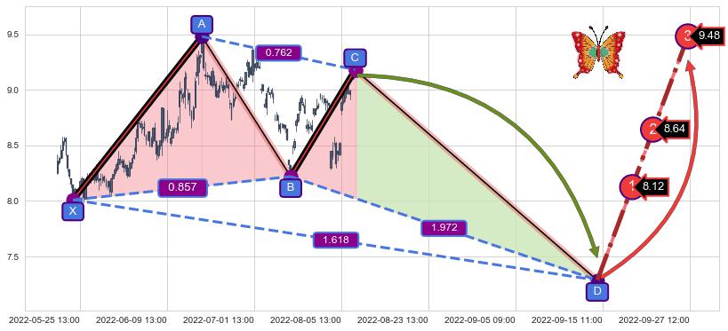 ➣ 未完成【蝴蝶】形态起点X: 05-24:14, 已到达C点: 08-12:13, 预测最终D点: 09-14:14, 共302交易小时