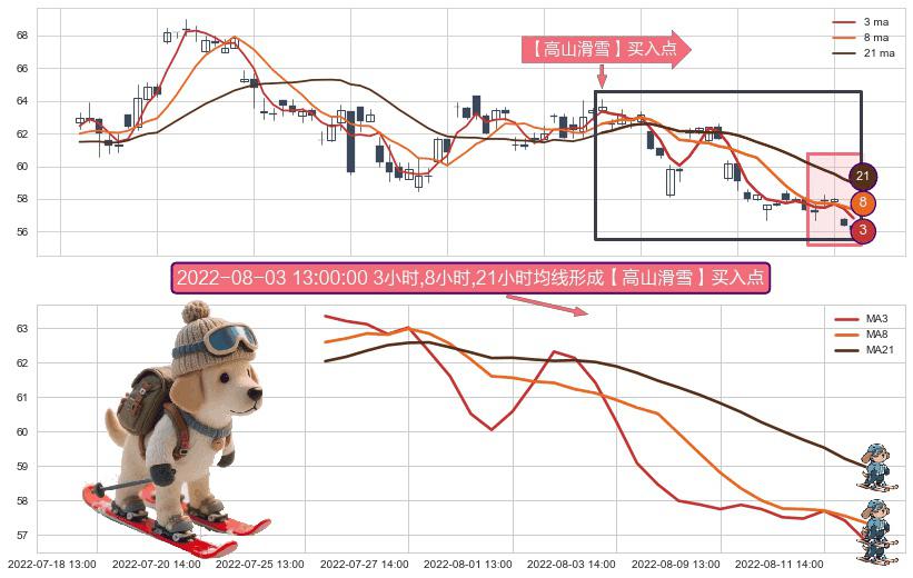 ⚀ 2022-07-25 14:00:00小时-2022-08-12 14:00:00小时显现 3小时-8小时-21小时均线 【高山滑雪】买入点 看多信号,后市看涨,买入