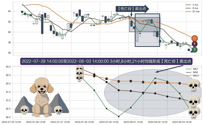 ⚀ 2022-07-29 13:00:00-小时至2022-08-03 14:00:00-小时显现 3小时-8小时-21小时均线 【死亡谷】卖出点 看空信号,后市看跌,卖出