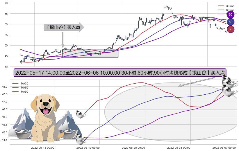 ⚀ 2022-05-18 09:00:00-小时至2022-06-06 10:00:00-小时显现 30小时-60小时-90小时均线 【银山谷】买入点 看多信号,后市看涨,买入