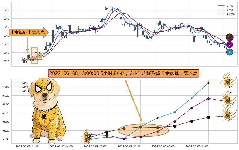 ⚀ 2022-06-08 13:00:00小时显现 5小时-8小时-13小时均线 【金蜘蛛】买入点 看多信号,后市看涨,买入
