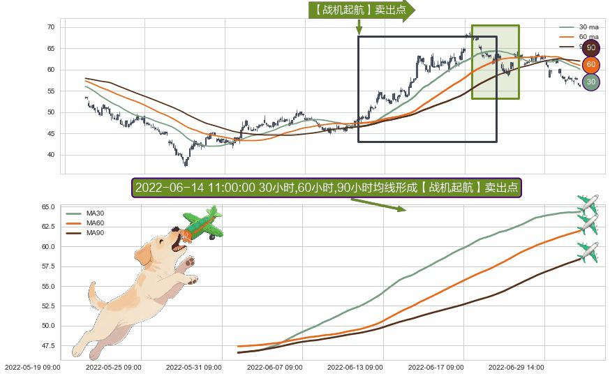 ⚀ 2022-05-31 14:00:00小时-2022-07-06 13:00:00小时显现 30小时-60小时-90小时均线 【战机起航】卖出点 看空信号,后市看跌,卖出