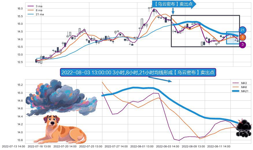 形态多维评估: ⚀ 2022-07-25 13:00:00小时-2022-08-12 14:00:00小时显现 3小时-8小时-21小时均线 【乌云密布】卖出点 看空信号,后市看跌,卖出