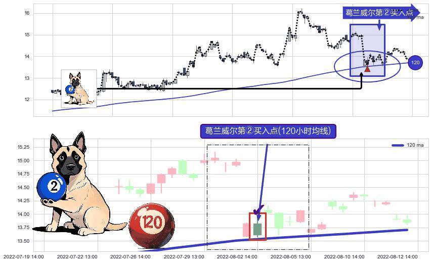 形态多维评估: ⚀ 2022-08-02 14:00:00-小时显现 葛兰威尔均线 120小时均线 第②买入点 上升趋势的中继信号,后市看涨,买进信号
