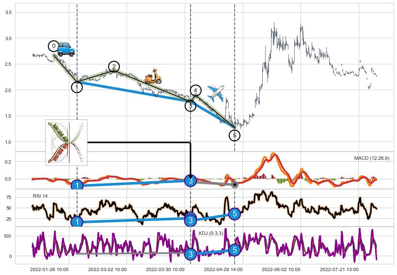 ➣ 1,3,5驱动浪MACD, RSI, KDJ走势都出现【常规背离】反转信号增强