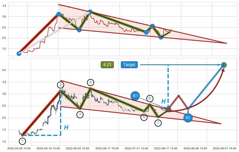 ➢ 最小中继整理涨幅→𝐇: 1.8500 (𝐇楔型旗杆的长度:楔型起点→顶点)