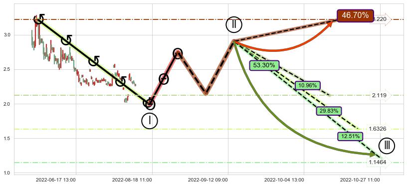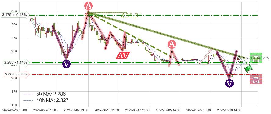 ♘ 在最后的下跌阶段2022-06-02 13:00至2022-08-05 13:00,存在 持续未破位的阻力位 ,阻力价格2.364,可信任强度78.77%,其距离最后价格2.260相差 +4.61%