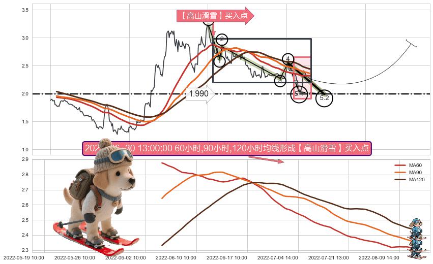 从2022-06-02 13:00至2022-08-05 13:00,共包含121个小时,阶段股价下跌-25.70%,阶段股价变动位移路程比: 1 : 7,下跌趋势角度: 35.3