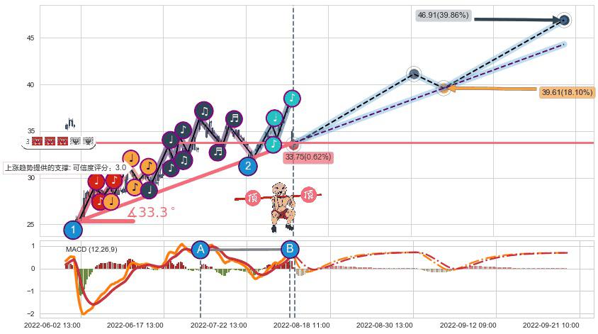 ♘ 在最后的上升阶段2022-06-02 11:00至2022-08-12 13:00存在 破位边缘的支撑位 ,支撑价格33.75,支撑可信任强度75.73%,其距离最后价格33.54相差 +0.62%