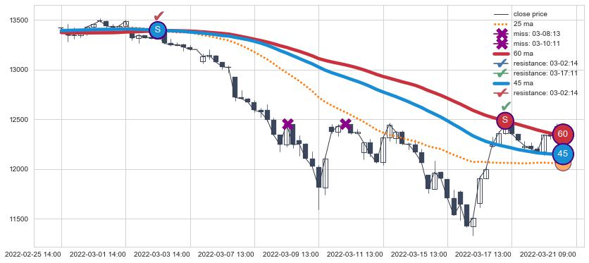⚄ 价格在均线遇到阻力后再次向下回落了【极短】距离, 第⑦卖出点 阻力效果【等待验证】