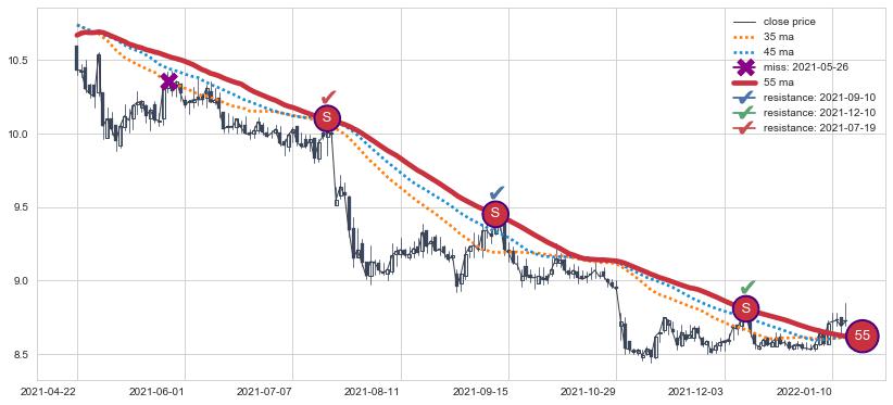 ➢ 最优均线组合共正确确认支撑阻力信号10处,正确确认率 66.67%
