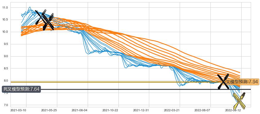 ➣ 70小时均线于(2022-07-05: 7.96)形成【死叉】基于【死叉历史模型】预测死叉后最低波谷价格: 7.34, 死叉后最低价格7.07,已经下跌超出预测最低波谷价格, 预期反弹