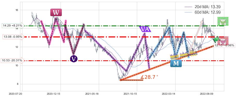 ♘ 支撑价格位10.53,可信任强度57.63%,距离最后交易2022-08-12形成的收盘价格13.21相差 -20.31%