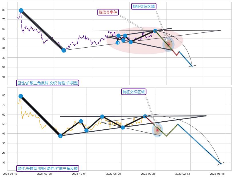 ➣ 扩散三角反转:猜想临近关键支撑位突破点 → 临近拐点下跌 → 风险信号 → 大趋势均值回复