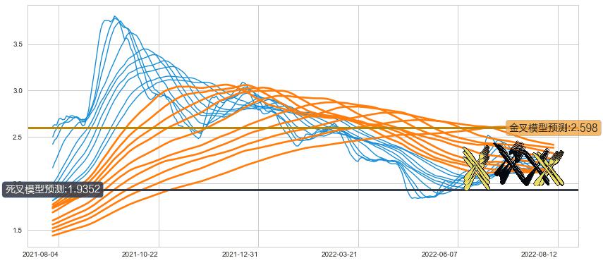 ➣ 60小时均线于(2022-08-01: 2.156)形成【死叉】基于【死叉历史模型】预测死叉后最低波谷价格: 1.8605, 死叉后最低价格2.100,尚未达到预测最低波谷价格, 预期继续下跌
