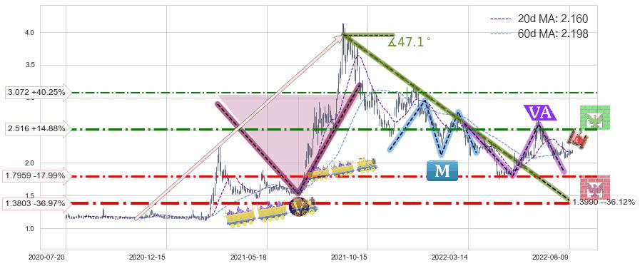♘ 阻力价格位2.516,可信任强度67.61%,距离最后交易2022-08-12形成的收盘价格2.190相差 +14.88%