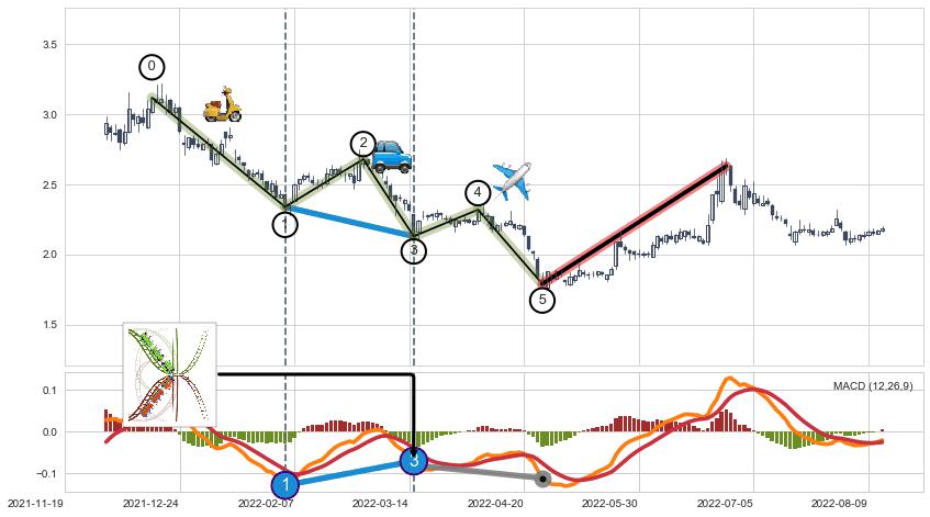 ➣ 波浪理论:猜想达到c点后小反弹终止反转下跌 → 下跌 → 【拐点】临近 → 阶段均值回复结束后继续大周期趋势跟踪