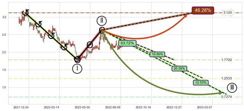 ➣ 调整浪已超过预测的c点位置,后续大趋势循环浪继续下跌概率53.72%,谨慎做多