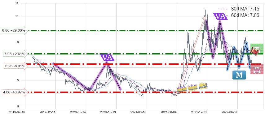 ♘ 阻力价格位7.05,可信任强度81.41%,距离最后交易2022-08-12形成的收盘价格6.87相差 +2.61%