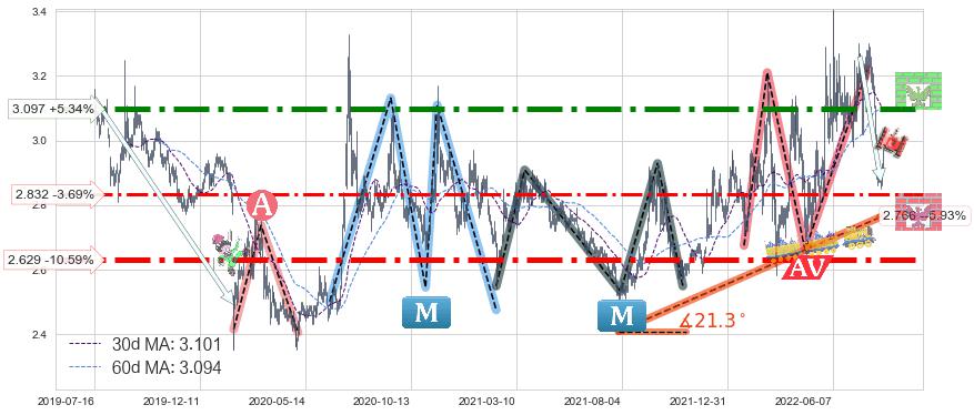 ♘ 阻力价格位3.097,可信任强度91.07%,距离最后交易2022-08-12形成的收盘价格2.940相差 +5.34%