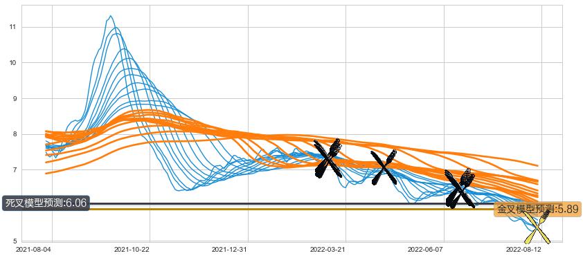 ➢ 34小时均线于(2022-06-20: 6.37)形成【死叉】基于【死叉历史模型】预测死叉后最低波谷价格: 5.79, 死叉后最低价格5.20,已经下跌超出预测最低波谷价格, 预期反弹