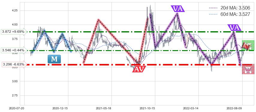 ♘ 阻力价格位3.872,可信任强度78.87%,距离最后交易2022-08-12形成的收盘价格3.530相差 +9.69%