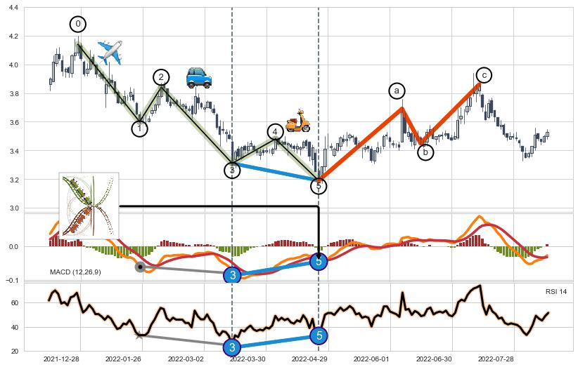 ➣ 第一, 三, 五浪下跌动能逐渐【衰弱变小】,趋势呈现不稳迹象