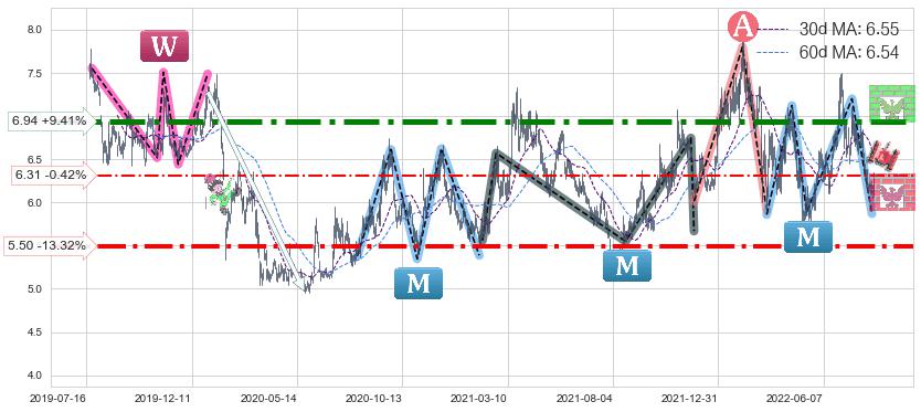♘ 阻力价格位6.94,可信任强度92.74%,距离最后交易2022-08-12形成的收盘价格6.34相差 +9.41%