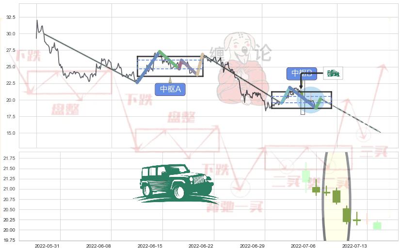 ➣ 【中枢B】:2022-05-30-2022-08-11,中枢由4笔构成,共53交易日, ZG=20.17, ZD=19.50