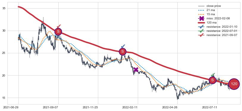 ➣ 21小时均线于(2022-07-14: 18.75)形成【死叉】基于【死叉历史模型】预测死叉后最低波谷价格: 16.63, 死叉后最低价格16.12,已经下跌超出预测最低波谷价格, 预期反弹