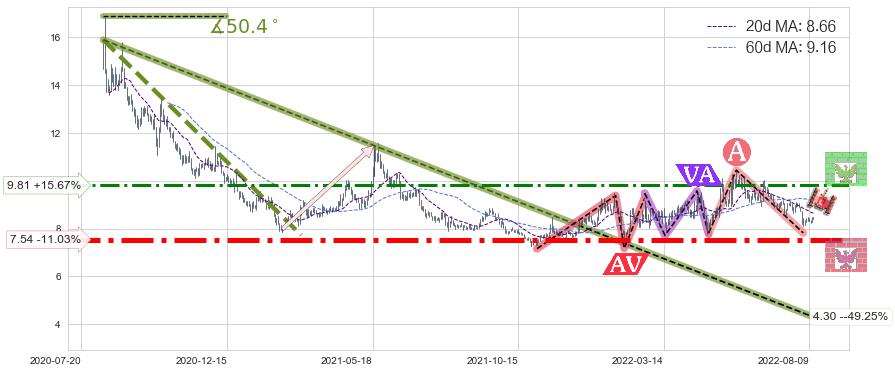 ♘ 支撑价格位7.54,可信任强度97.75%,距离最后交易2022-08-12形成的收盘价格8.48相差 -11.03%