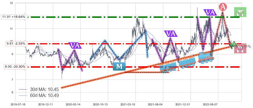 ♘ 支撑价格位9.81,可信任强度71.74%,距离最后交易2022-08-12形成的收盘价格10.04相差 -2.33%