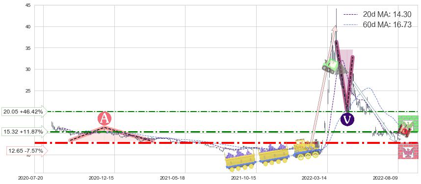 ♘ 阻力价格位20.05,可信任强度40.09%,距离最后交易2022-08-12形成的收盘价格13.69相差 +46.42%