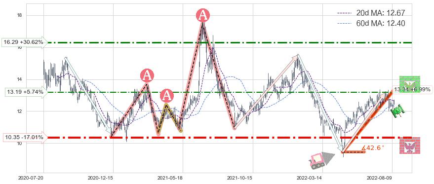 ♘ 阻力价格位13.19,可信任强度47.93%,距离最后交易2022-08-12形成的收盘价格12.47相差 +5.74%