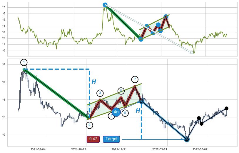 ➣ 最小中继整理跌幅→𝐇: 5.63 (𝐇旗杆的长度:旗杆起点→顶点)