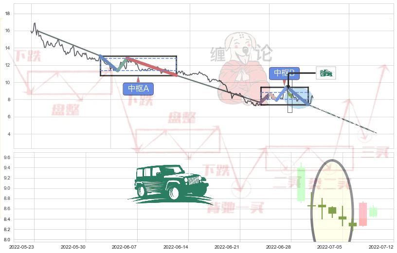 ➣ 【中枢B】:2022-05-11-2022-08-04,中枢由5笔构成,共61交易日, ZG=8.67, ZD=7.90