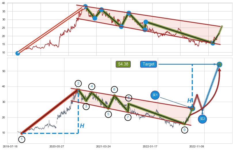 ➣ 降旗形:猜想临近关键阻力位突破点 → 临近拐点上涨 → 机会信号 → 大趋势均值回复