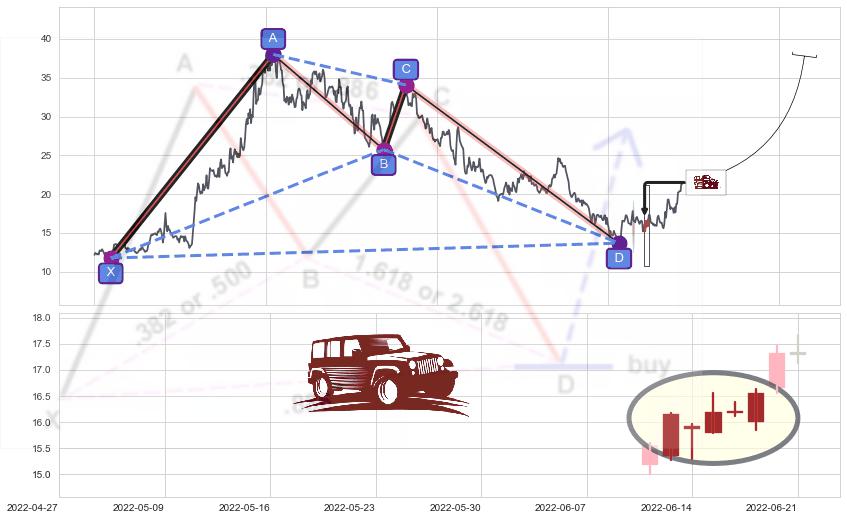 ➢ 谐波蝙蝠:c下跌到达d:猜想拉升 → 上涨 →【拐点】强支撑临近 → 大趋势均值回复