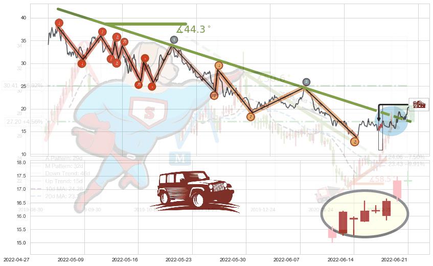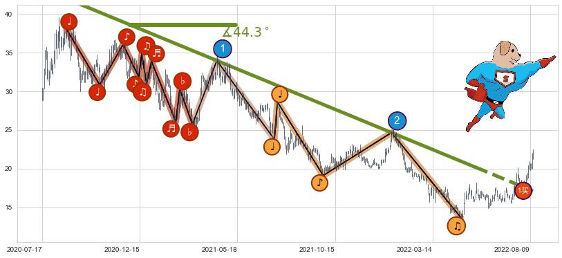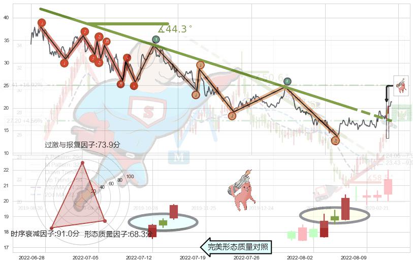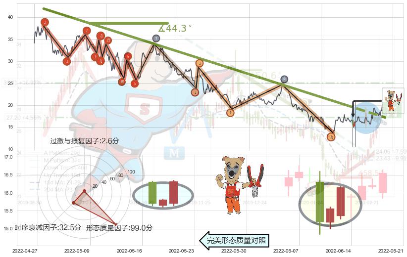 ➣ 2020-08-21-2022-05-20下跌趋势存在反转上涨[机会],其原下跌趋势的阻力位(17.11)已被突破[强支撑信号],原下跌趋势角度: 44.3˚