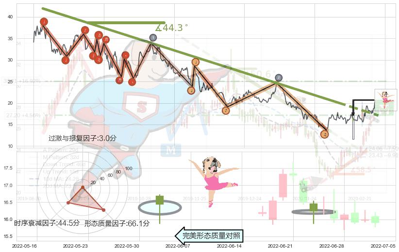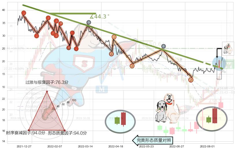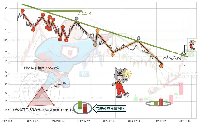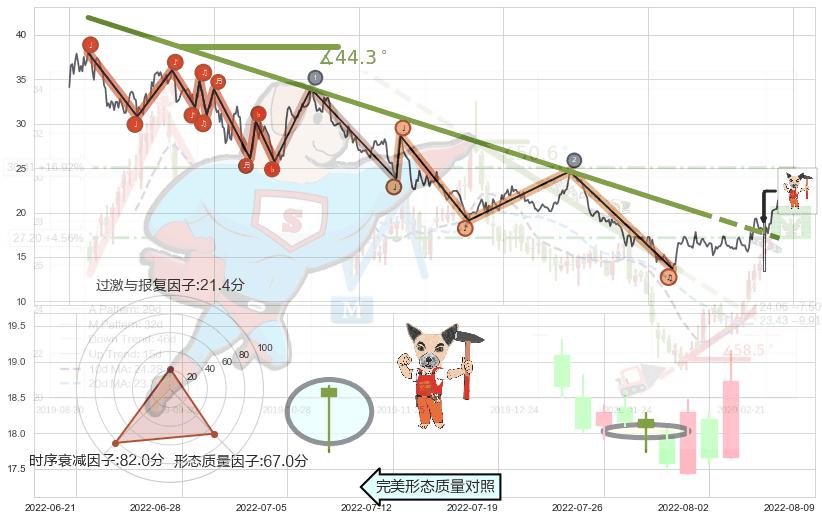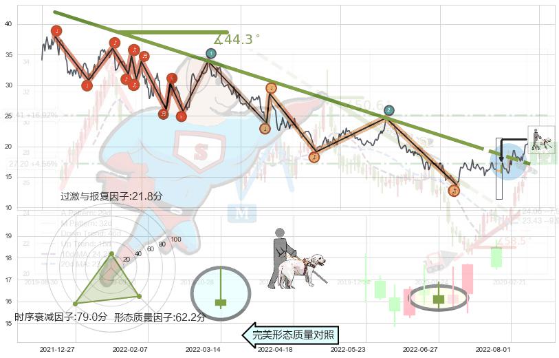 ➢ 2020-08-21-2022-05-20下跌趋势存在反转上涨[机会],其原下跌趋势的阻力位(17.11)已被突破[强支撑信号],原下跌趋势角度: 44.3˚