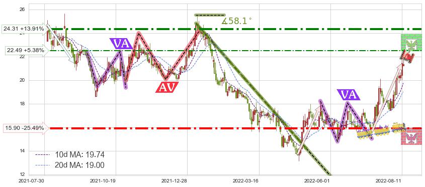 ♘ 阻力价格位22.49,可信任强度51.47%,距离最后交易2022-08-12形成的收盘价格21.34相差 +5.38%