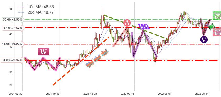 ♘ 支撑价格位47.68,可信任强度84.22%,距离最后交易2022-08-12形成的收盘价格49.45相差 -3.57%